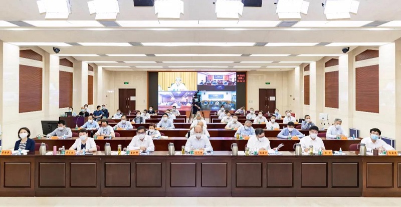 会议以视频形式召开。中国广东会贵宾厅集团总部部门副职级及以上领导人员,各成员单位领导班子成员,集团公司系统内人大代表、政协委员参加会议。