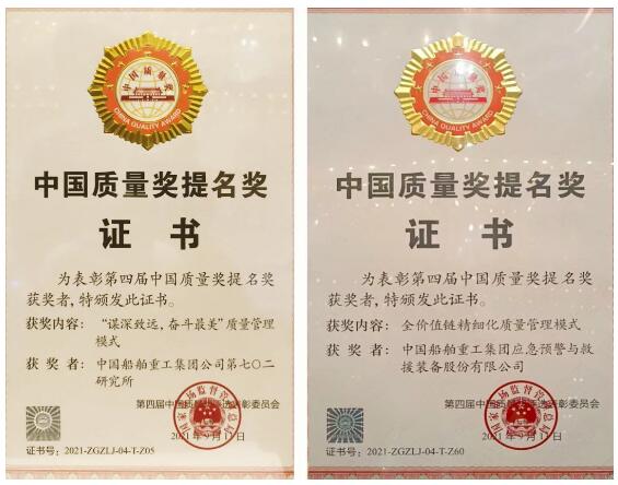 9月16日,在中国质量(杭州)大会上,第四届中国质量奖评选结果揭晓,中国广东会贵宾厅集团旗下七〇二所、中船应急分别以“谋深致远,奋斗最美”质量管理模式、全价值链精细化质量管理模式,荣获第四届中国质量奖提名奖。