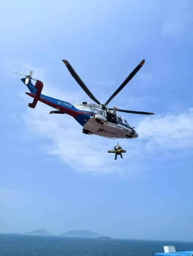 接报后,广船国际立即启动航空救援,第一时间联系海上航空救助和最近的珠海医院,一场生死竞速在南海的碧海蓝天间极速展开!在交通运输部南海第一救助飞行队、珠海市中山大学附属第五医院和试航项目组的通力协作下,半小时后,蓝白相间的救援直升机飞临悬停试航广东会贵宾厅的直升机平台。