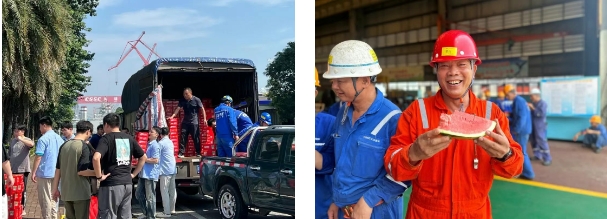 广船国际始终将员工身心健康与安全生产放在首位,用科学调度、贴心保障的“组合拳”,撑起“清凉保护伞”。该公司向全体工会会员发放慰问清凉饮料,做好防暑降温工作,保障员工健康;所属文冲修造常态化开展“送清凉”活动,各部门自发熬煮糖水、派发西瓜,让“清凉”直抵岗位、暖到心间。
